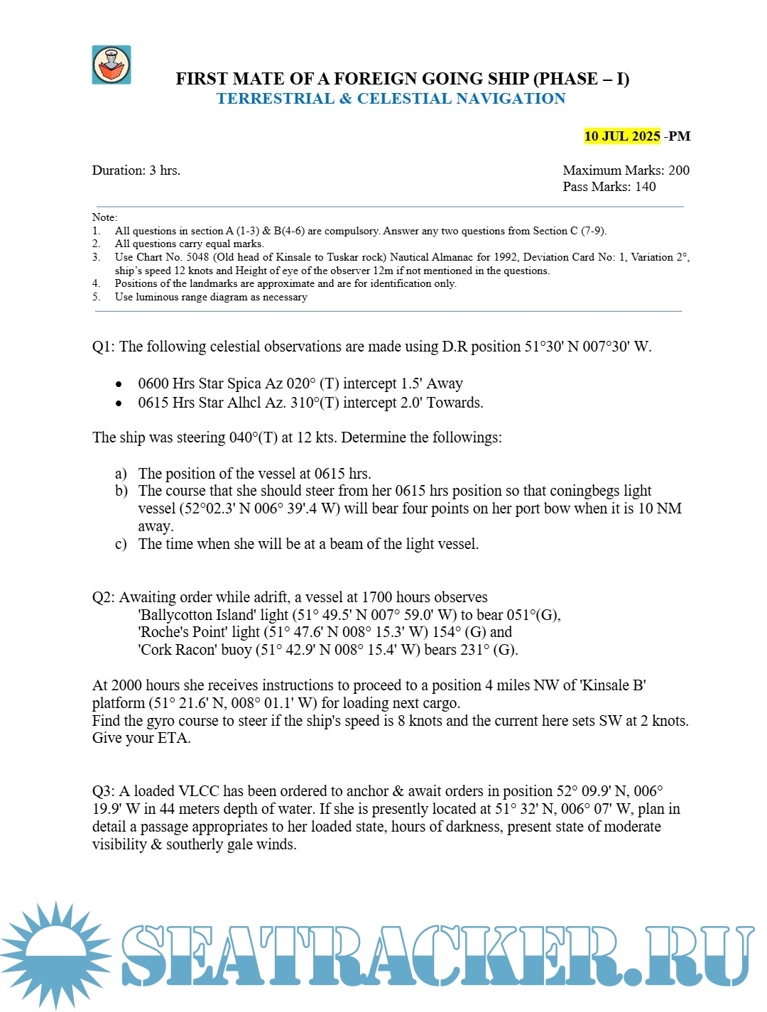 Question Paper Set Terrestrial and Coastal Navigation (July 2025) Phase I (Chief Mate F.G.) Mercantile Marine Department (MMD), India Examinations