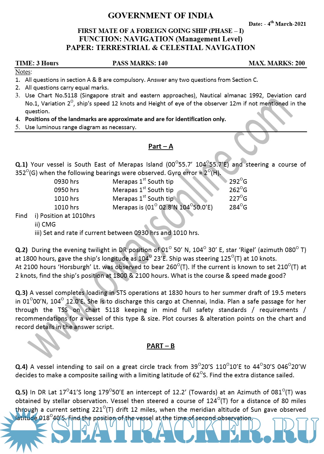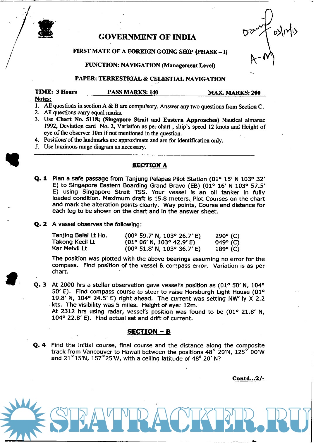 Description: Question paper set for Terrestrial and Coastal Navigation Mercantile Marine Department (MMD), India Exams for Phase I - Chief Mate (F.G.).