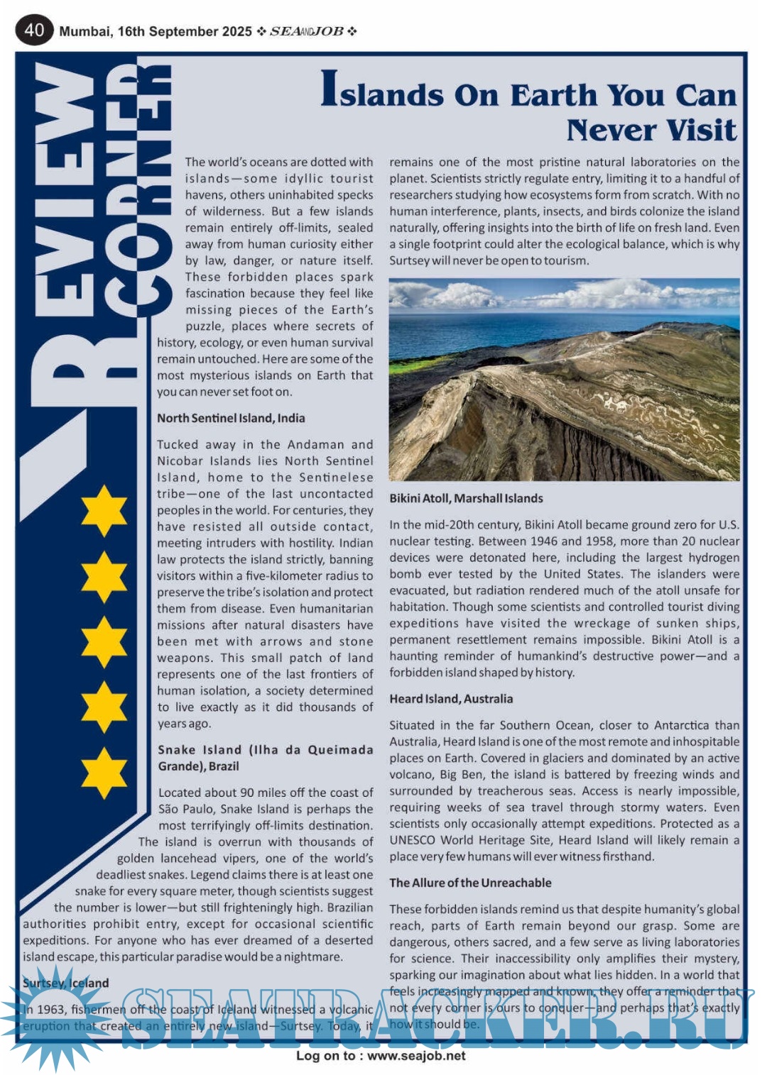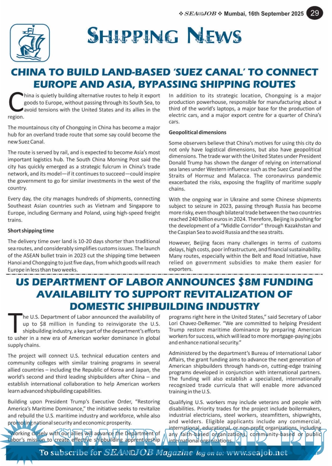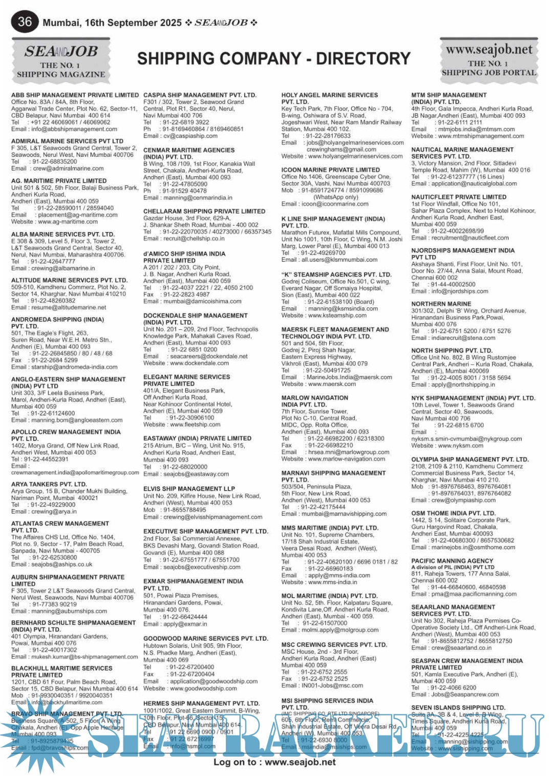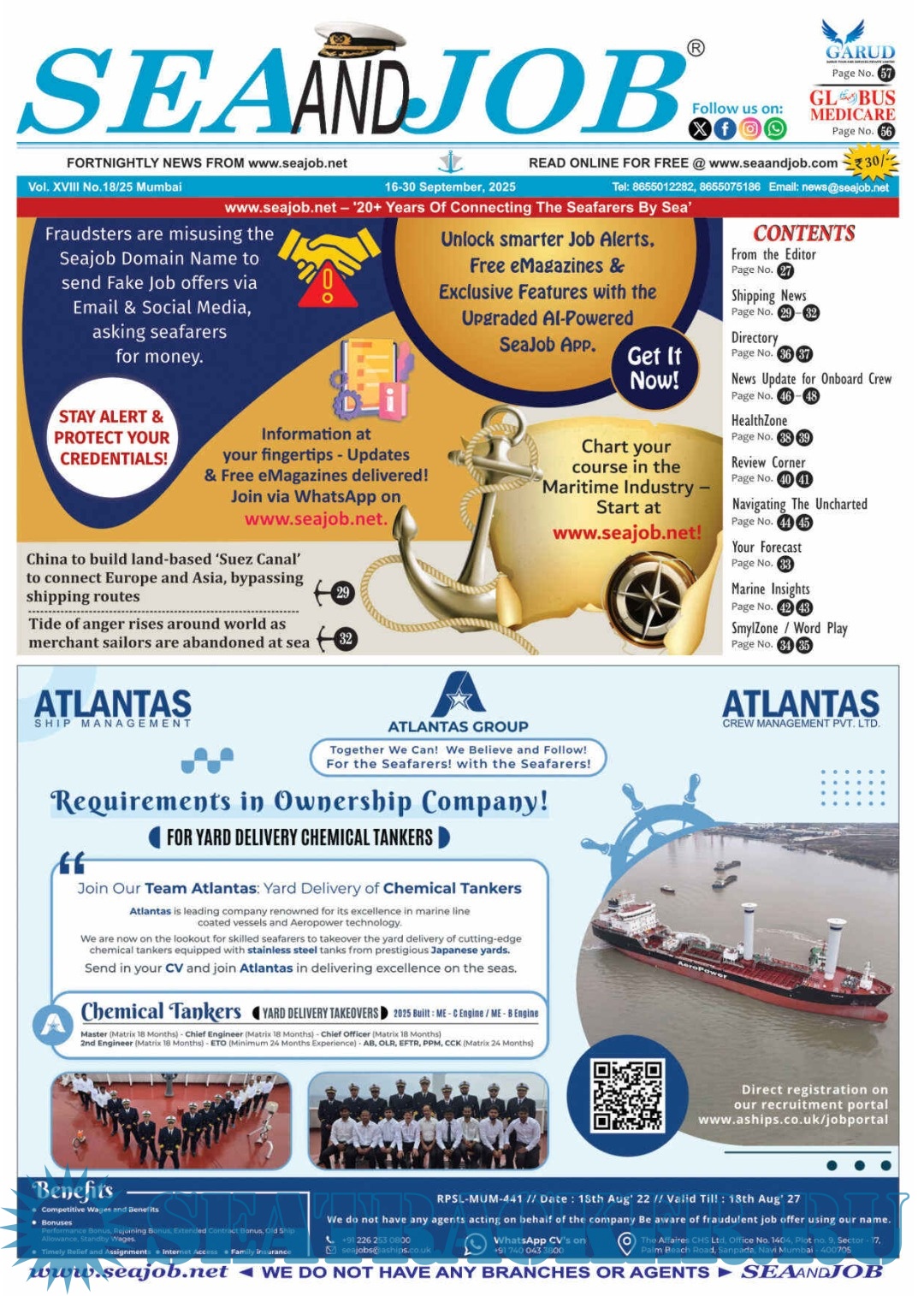 Description: he Sea and Job magazine launched in May 2007, was the second venture of Sea Line Group succeeding 'seajob.net' bringing the much renowned essence to the Group, the Sea and Job Magazine quickly gained popularity, becoming the No. 1 Shipping Magazine that came to be widely circulated all over India.Sea and Job over the years has evolved as the most trusted, ethical, objective and read maritime publication that possesses a large database of subscribers from various verticals in the industry.The magazine provides informative and interesting articles covering not just the shipping world but also the world outside it. Sea and Job is also a medium for the shipping/ manning companies to advertise marine jobs and also to promote their organization by publicizing internal activities like seminars, sports events and parties.Some notable endeavors of the magazine include the Know Your Recruiter Column, the Sailing Episodes Column and the Marine Insights section. The consistent efforts and the dedication to provide extraordinary services to the industry has resulted in the magnifying popularity and patronage of Sea and Job.