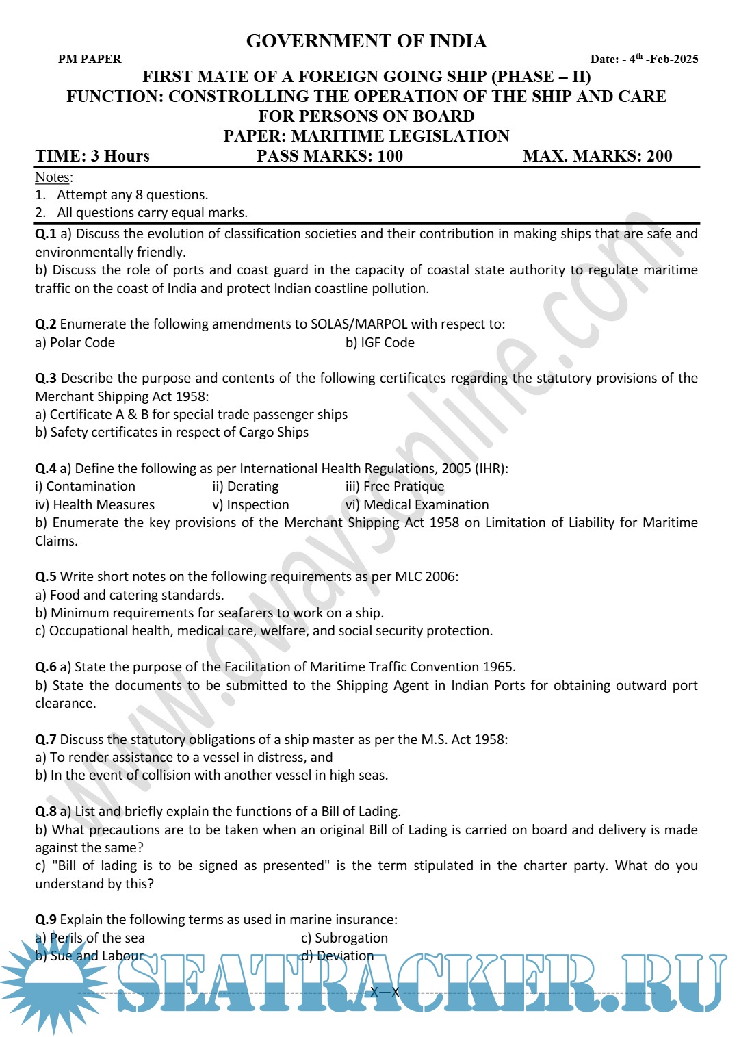 Question Paper Set for Maritime Legislation (November) Phase II (Chief Mate F.G.) Mercantile Marine…