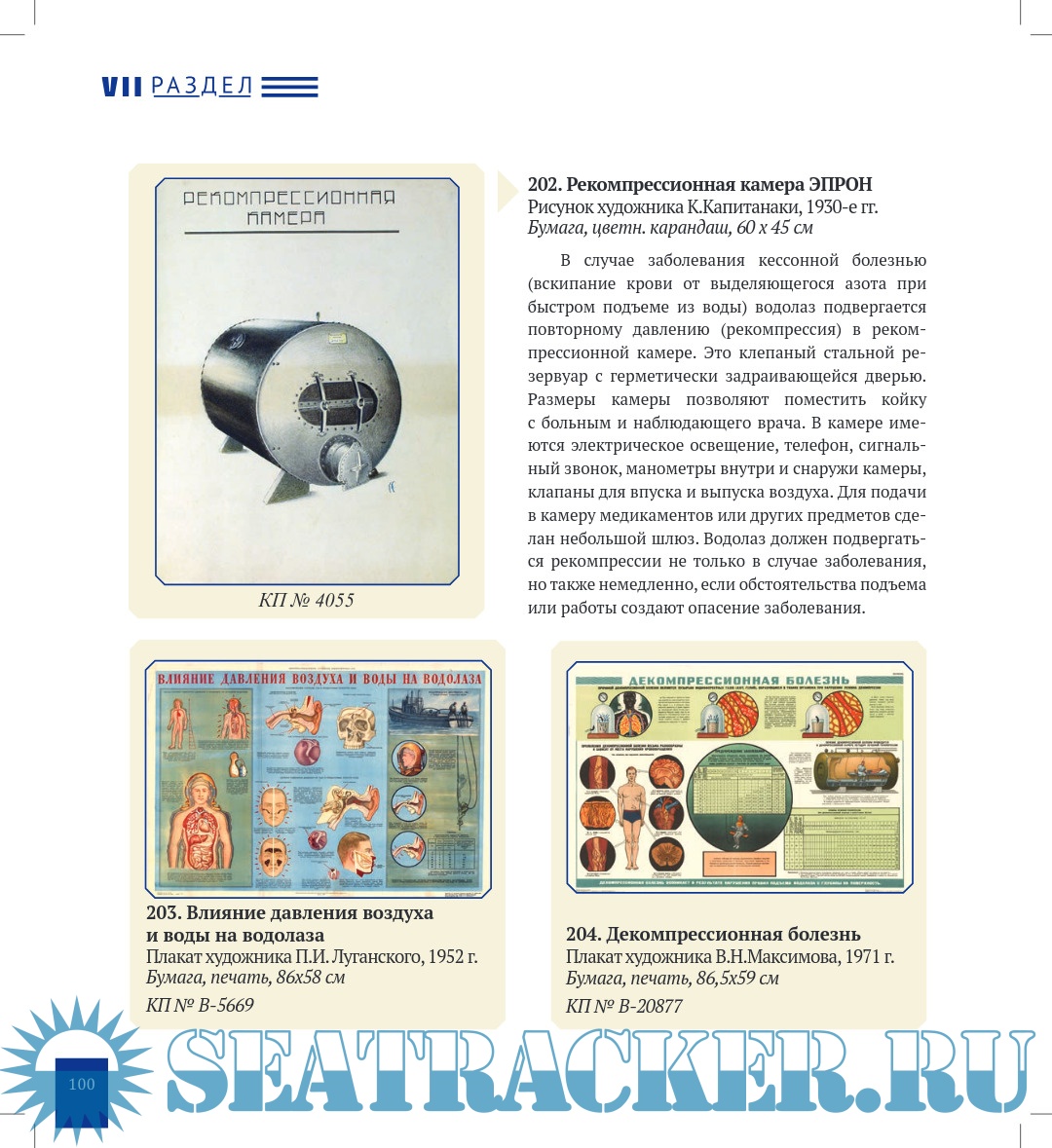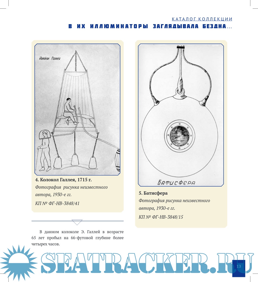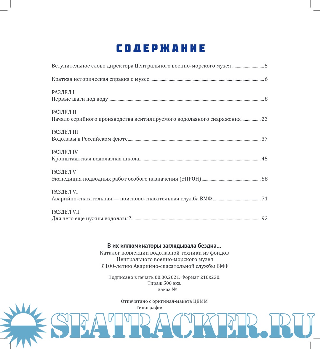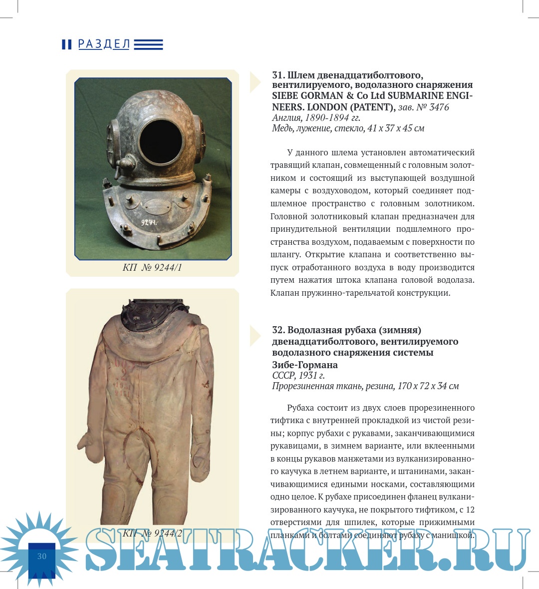 В данной работе систематизирована и представлена богатейшая коллекция водолазного снаряжения, инструментов для подводных работ, осветительных приборов, помп, средств связи и других атрибутов подводных работ (спасательных, поисковых технических, диверсионных и научноисследовательских) за всю историю музея с 1709 года по настоящее время.