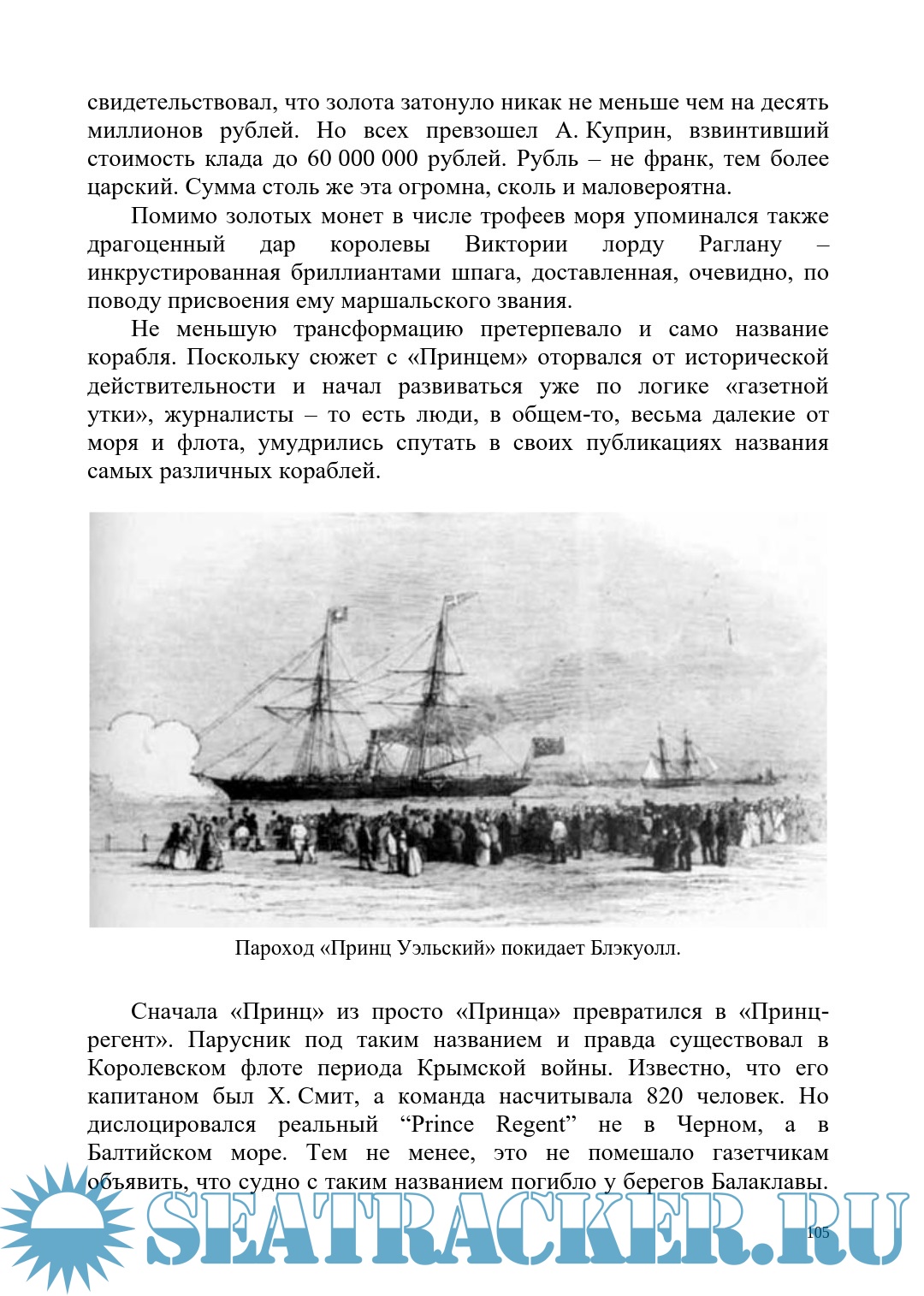 Описание: В документальной повести рассказывается об одном из самых масштабных кораблекрушений у берегов Крыма, когда в результате урагана 14 ноября 1854 года на дне оказались шесть десятков военных кораблей и транспортов войск антирусской коалиции. В то утро на Балаклавском рейде погибло парусно-винтовое судно «Принц», доставившее осаждавшим Севастополь англичанам теплое обмундирование, припасы и продовольствие. Считалось, что на борту «Принца» находилась золотая казна, предназначенная для выплаты жалования солдатам. Вот уже более полутора веков кладоискатели разных стран пытаются отыскать подводное сокровище, но безуспешно. История гибели и поисков золотоносного парохода представляется на фоне событий Крымской войны, политической борьбы и реформ в Англии второй половины XIX века, что дает возможность сформулировать собственный ответ на вопрос – как возникла легенда о «Черном Принце».