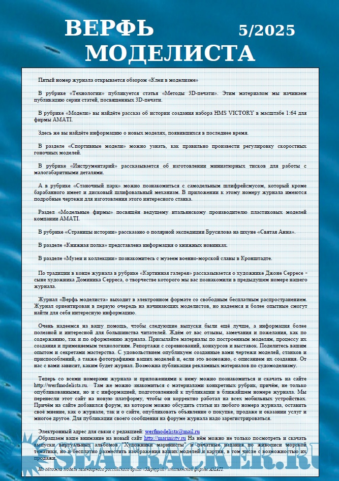 Описание: Журнал «Верфь моделиста» выходит в электронном формате со свободным бесплатным распространением. Журнал ориентирован в первую очередь на начинающих моделистов, но надеемся и более опытные смогут найти для себя интересную информацию.