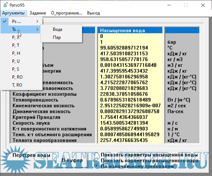 Год выпуска: 2005 Версия: 3.4 (Windows 32-bit) Разработчик: Иванов М. Ю. Платформа: Windows Совместимость с 64-битными ОС: да Системные требования: Windows (32-bit) Язык интерфейса: Русский Таблэтка: Не требуется Название: Теплофизические свойства воды и водяного пара Система уравнений: IAPWS Formulation 1995 Лицензия: Бесплатное распространение (Freeware) Описание: Программа предназначена для расчёта и анализа теплофизических свойств воды и водяного пара в широком диапазоне температур и давлений на основе международной научной модели IAPWS-95 (International Association for the Properties of Water and Steam). С помощью данного приложения можно точно определить такие параметры, как: