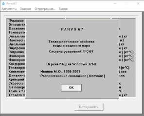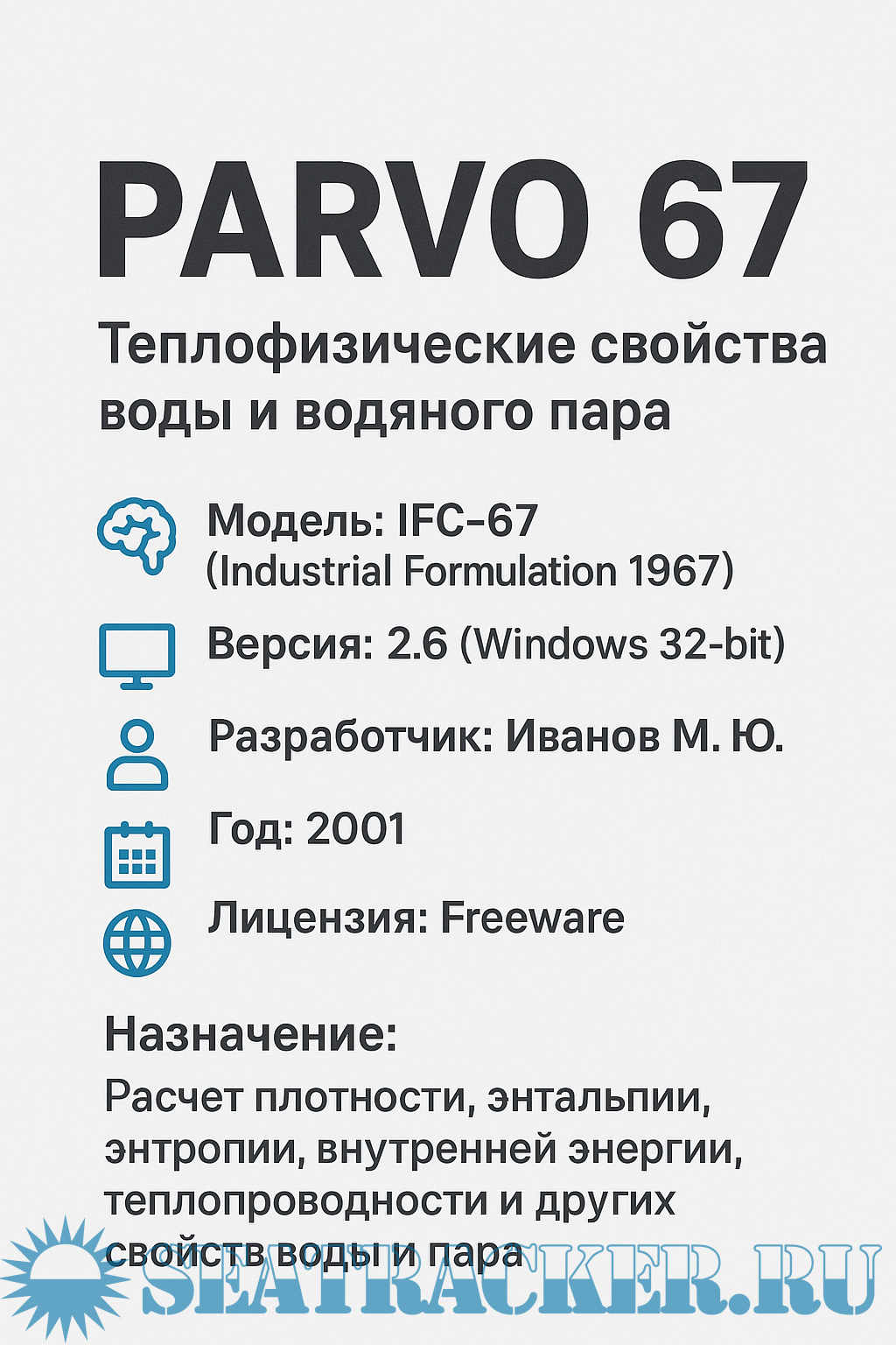 Год выпуска: 2001 Версия: 2.6 (Windows 32-bit) Разработчик: Иванов М. Ю. Платформа: Windows Совместимость с 64-битными ОС: да Системные требования: Windows (32-bit) Язык интерфейса: Русский Таблэтка: Не требуется Название: Термодинамические свойства воды и водяного пара (PARVO 67) Система уравнений: IFC-67 (Industrial Formulation 1967) Лицензия: Бесплатное распространение (Freeware) Описание: Программа PARVO 67 реализует расчёт термодинамических и теплофизических свойств воды и водяного пара в широком диапазоне температур и давлений на основе стандартной формулы **IFC-67**, принятой в 1967 году для промышленного применения (принята как основа «ASME Steam Tables»). :contentReference[oaicite:0]{index=0} С помощью PARVO 67 можно вычислять такие параметры, как: