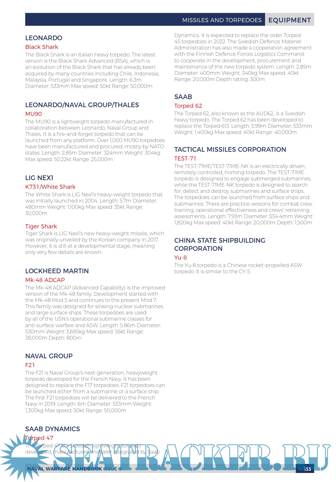 This section covers a selection of missiles and torpedoes under development or in production, including anti-ship, multipurpose, surface-to-air and surface-to-surface