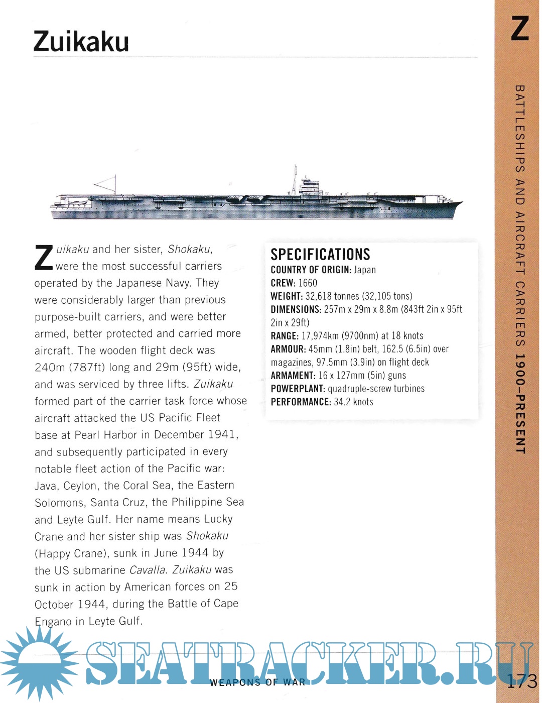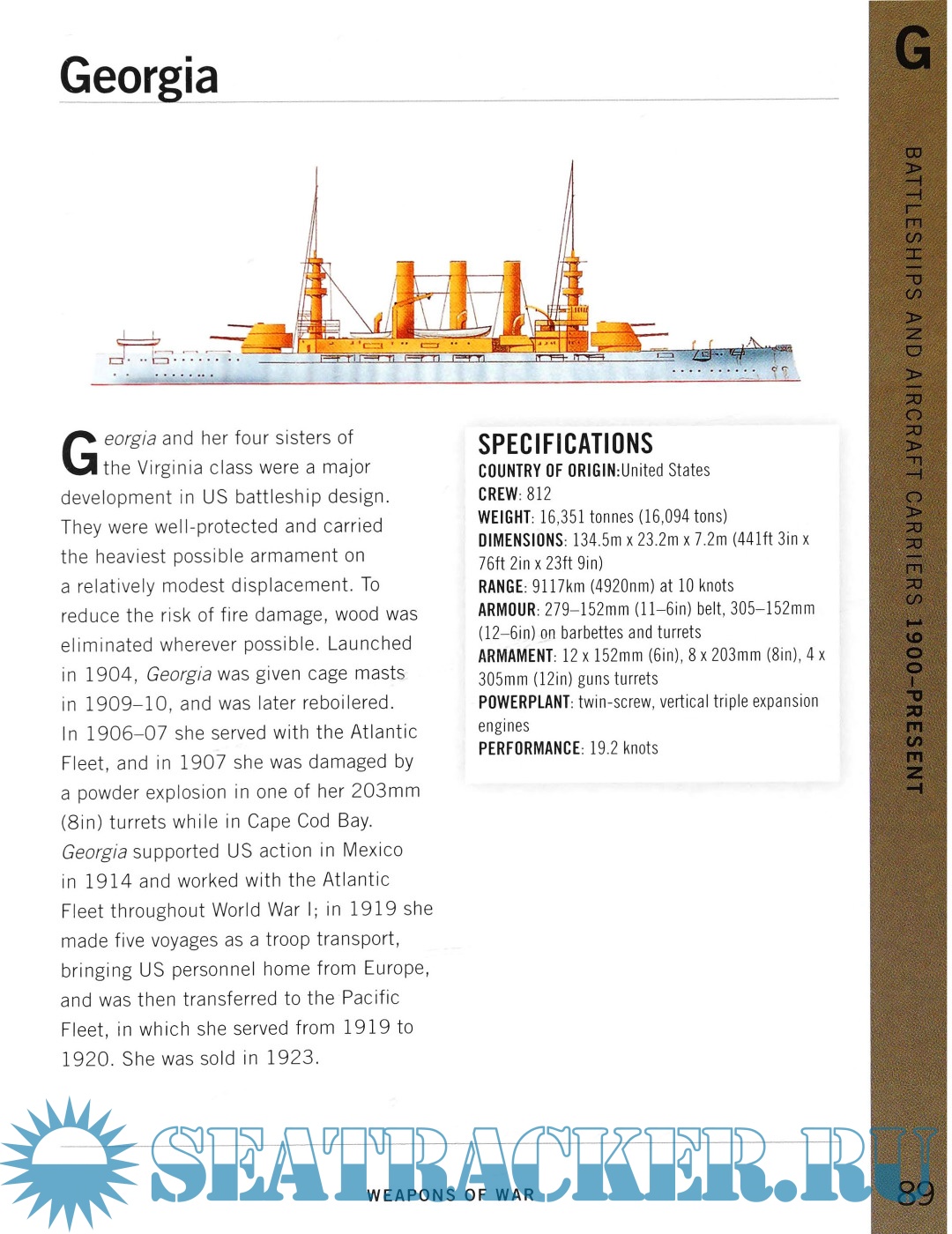Each entry includes a specifications table with essential information such as armament, weight, speed, and range