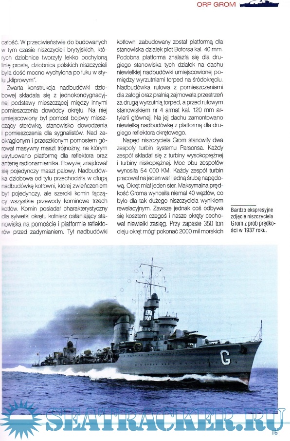 Zamowienie, projekt i budowa ORP Grom Chatrakterystyka techniczna Przedwojenna sluzba Groma i "plan Pekin" Dzialania Groma u boku Royal Navy Grom pod Narvikiem Grom odnaleziony Bibliografia wybrana Modele nisczyciela ORP Grom