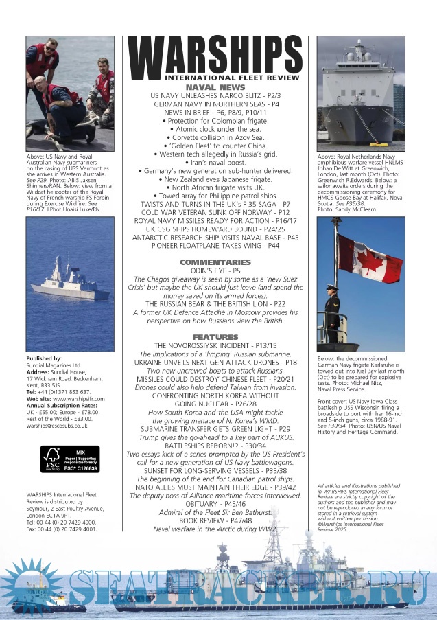 Year: 2025 Language: English Author: Iain Ballantyne (Editor) Genre: Periodical publication Edition: 2025-12 Format: PDF Quality: eBook Pages count: 52 Description: Warships IFR puts the spotlight on the latest developments in the world’s navies. It covers current defence issues and has comments by leading analysts. The magazine regularly includes features on the Royal Navy and the US Navy in addition to incorporating news and features on all other navies across the globe. Warships IFR frequently carries in-depth articles on naval heritage.WARSHIPS International Fleet Review is published 12 times a year by Tandy Media Ltd who also publish Shipping Today & Yesterday (which provides news and features from the world of merchant shipping).