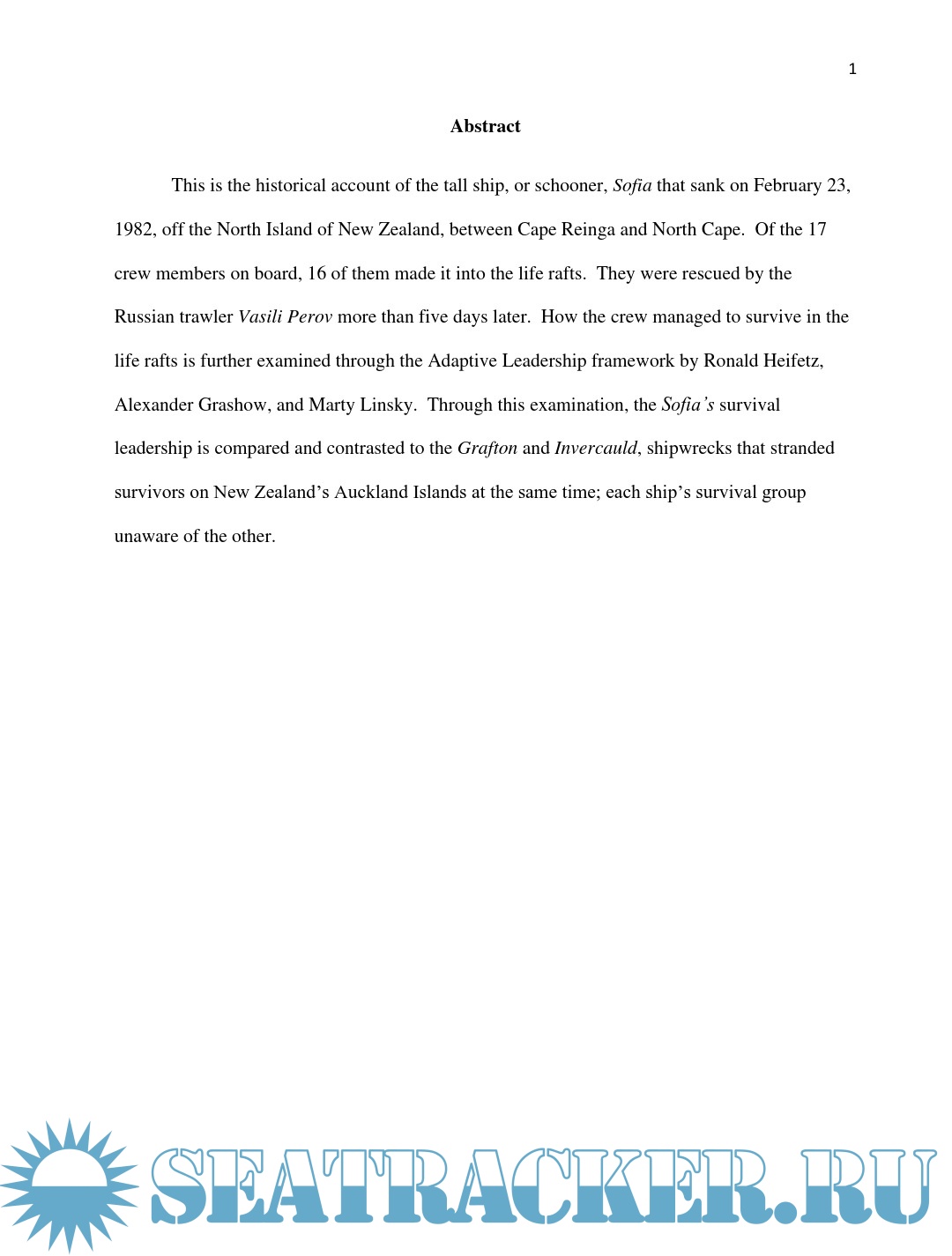 Description: This is the historical account of the tall ship, or schooner, Sofia that sank on February 23, 1982, off the North Island of New Zealand, between Cape Reinga and North Cape. Of the 17 crew members on board, 16 of them made it into the life rafts. They were rescued by the Russian trawler Vasili Perov more than five days later. How the crew managed to survive in the life rafts is further examined through the Adaptive Leadership framework by Ronald Heifetz, Alexander Grashow, and Marty Linsky. Through this examination, the Sofia’s survival leadership is compared and contrasted to the Grafton and Invercauld, shipwrecks that stranded survivors on New Zealand’s Auckland Islands at the same time; each ship’s survival group unaware of the other.