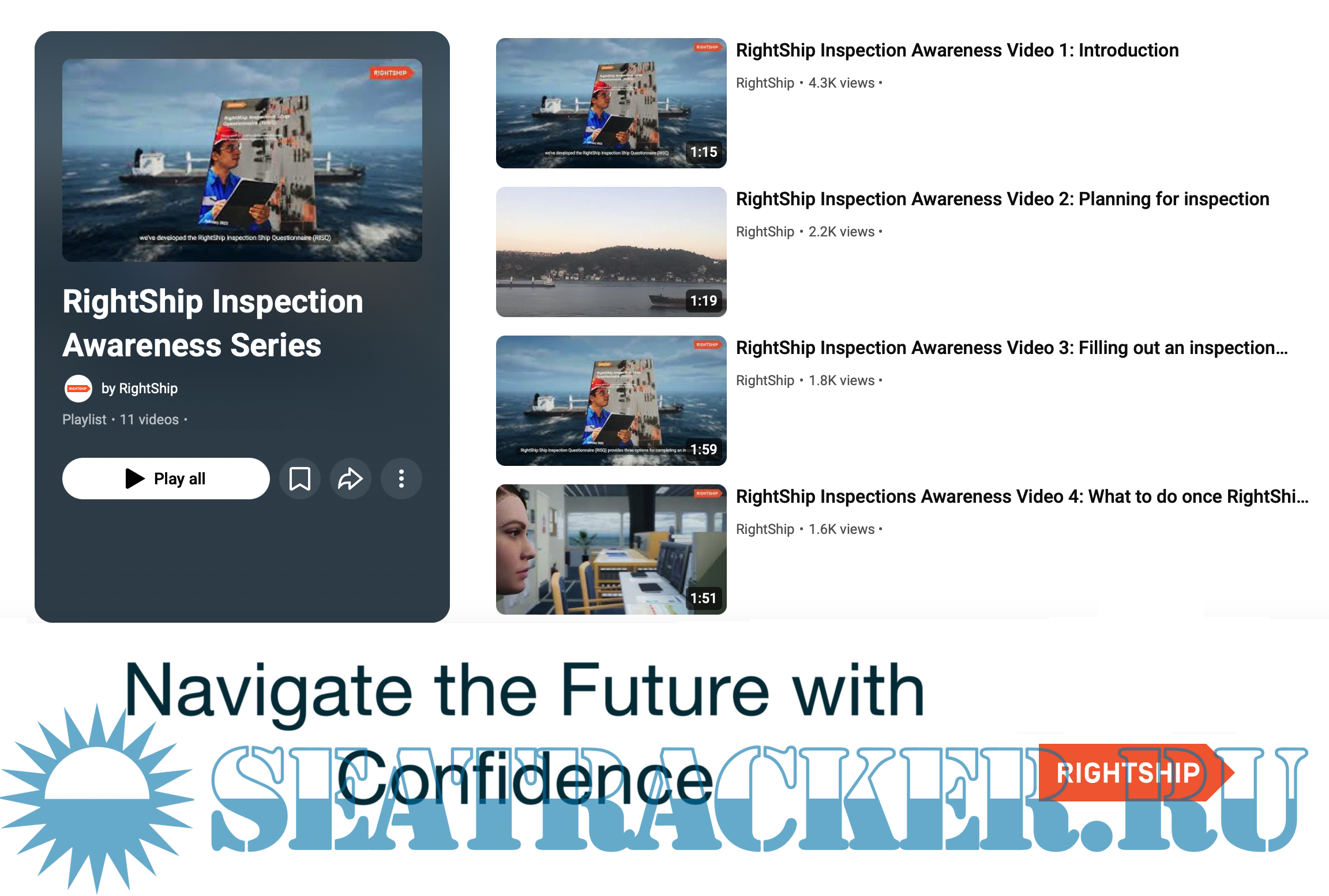 *** RightShip Inspection Awareness Videos 1 - 11 contents: Video 1: Introduction Video 2: Planning for inspection Video 3: Filling out an inspection application form Video 4: What to do once RightShip appoints the inspector Video 5: Are the ship and crew prepared for the RightShip inspection? Video 6: Preparing the ship for inspection - ship management companies Video 7: How to prepare the ship for inspection as the ship’s team Video 8: RightShip inspection - opening meeting Video 9: What happens during a RightShip inspection Video 10: RightShip inspection closing meeting Video 11: RightShip inspection code of conduct ***