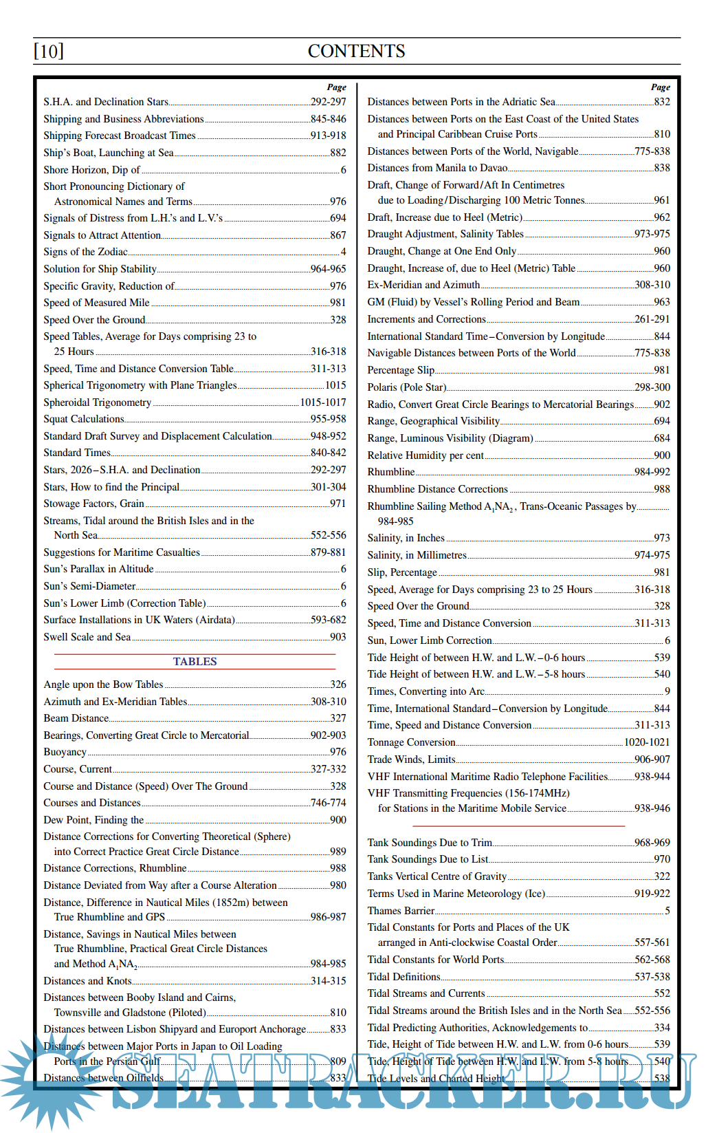 - V Navigable Distance Tables giving a world-wide coverage of total distances from the principal ports of Britain, U.S.A. and Canada, to all important ports of the world.
