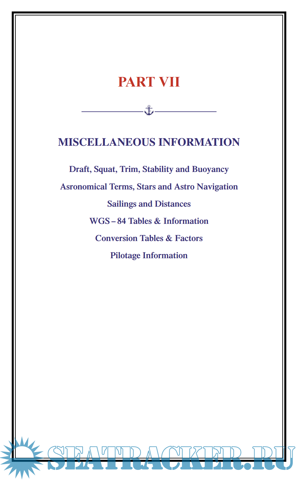 - VII Miscellaneous Information covering Stability, Buoyancy, Celestial, Sailings and Navigation. The Pilotage Information section has been revised to conform with notices issued by Admiralty, Hydrographic Authorities and Port Authorities.