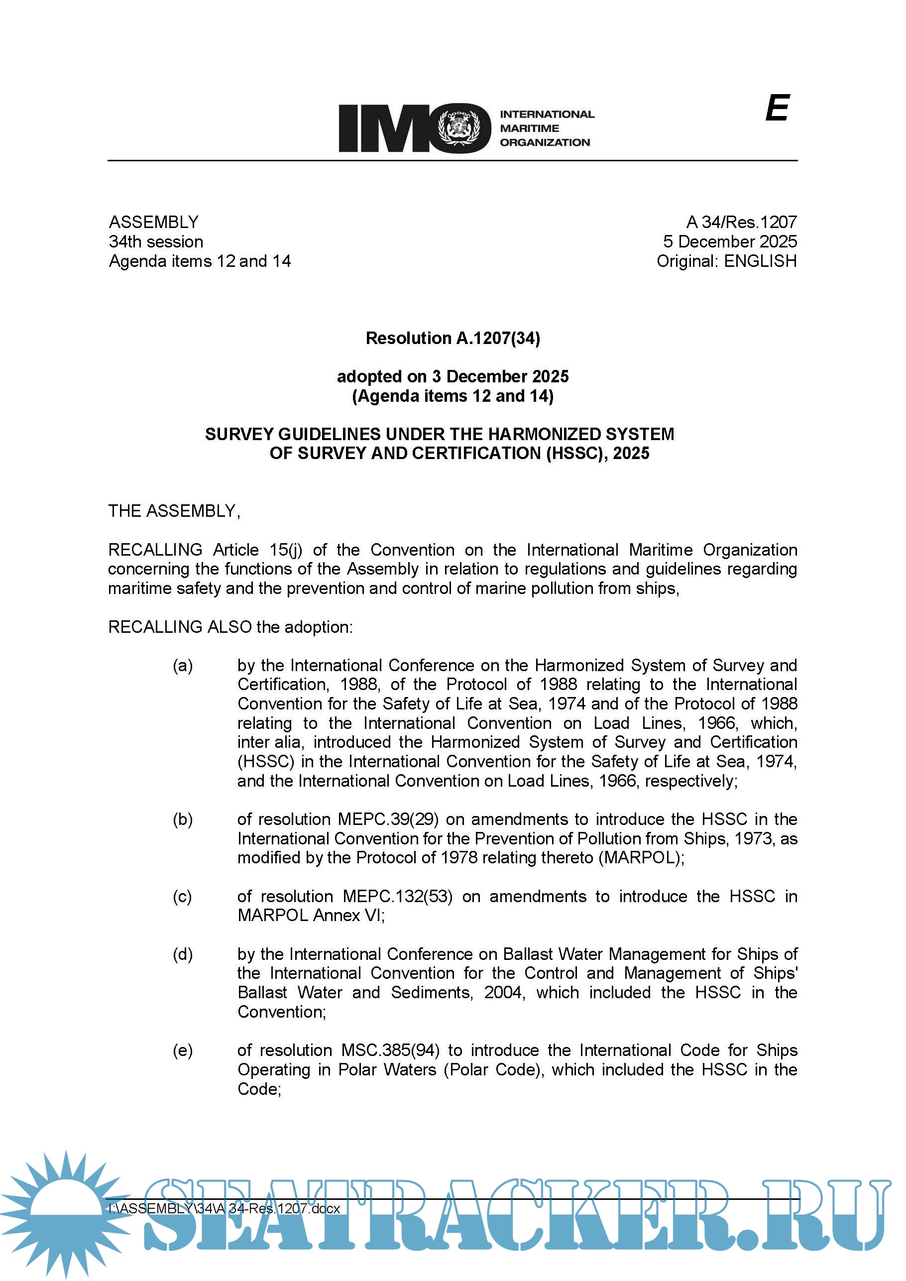 Description: Of the Convention on the International Maritime Organization concerning the functions of the Assembly in relation to regulations and guidelines regarding maritime safety and the prevention and control of marine pollution from ships.
