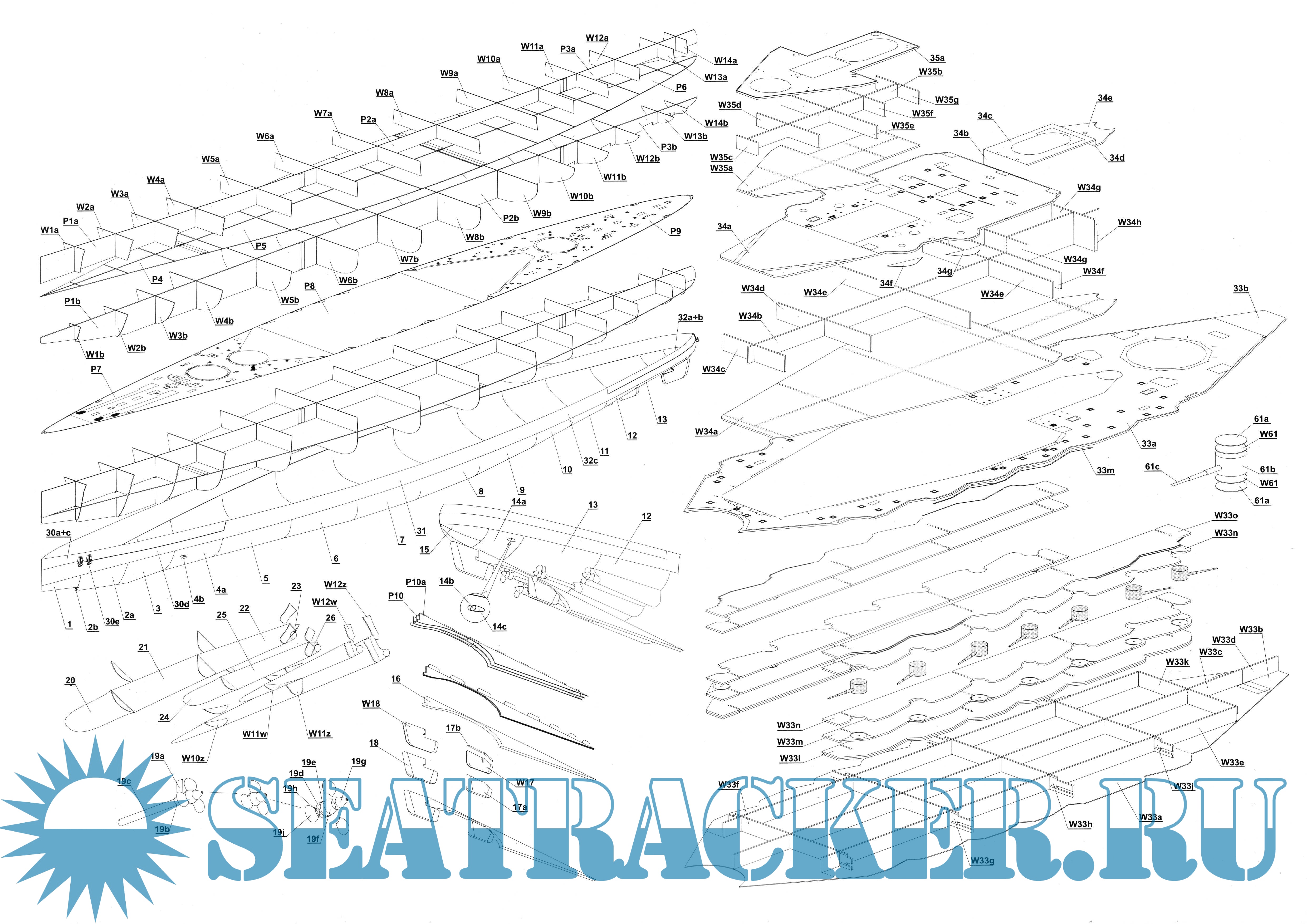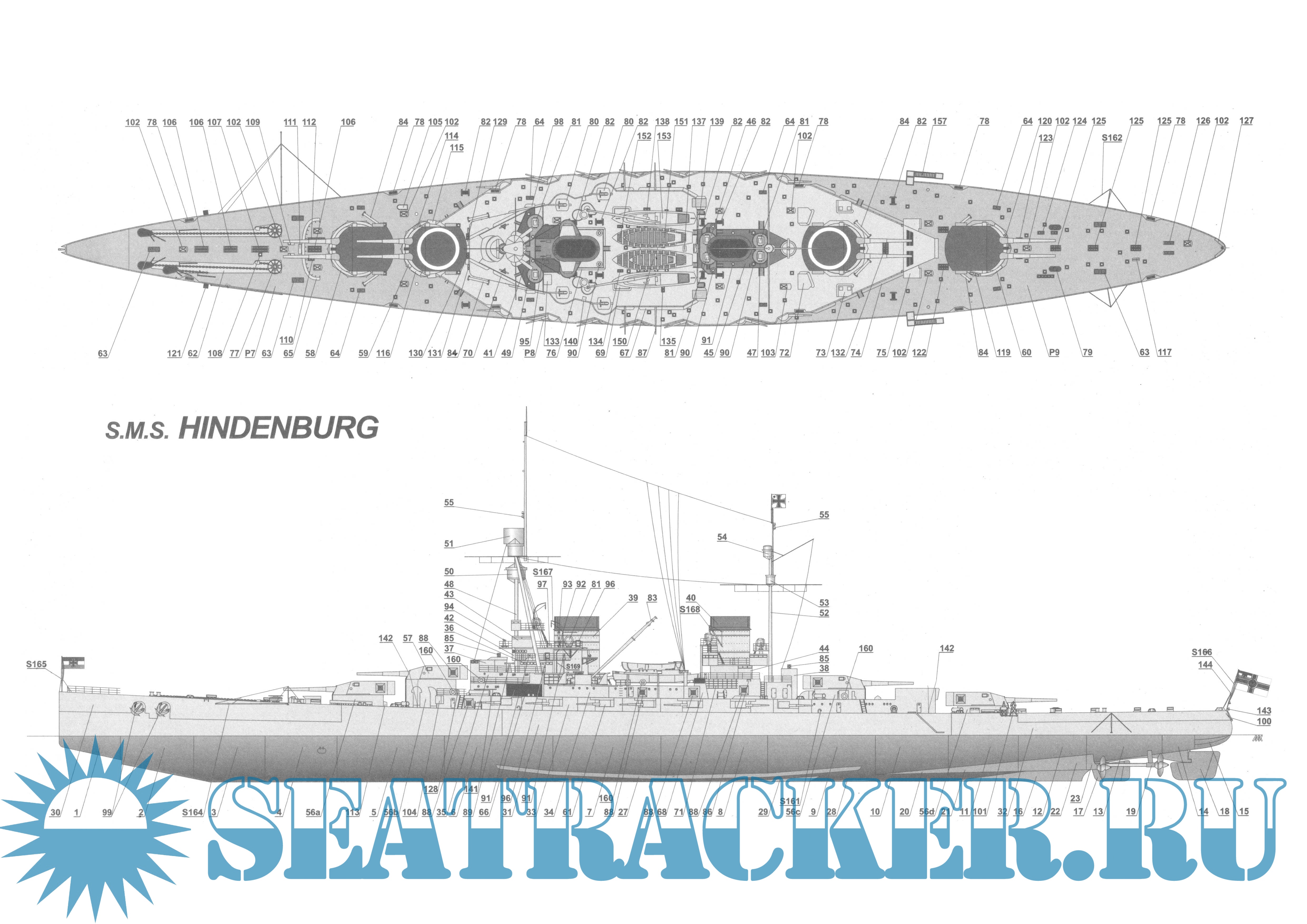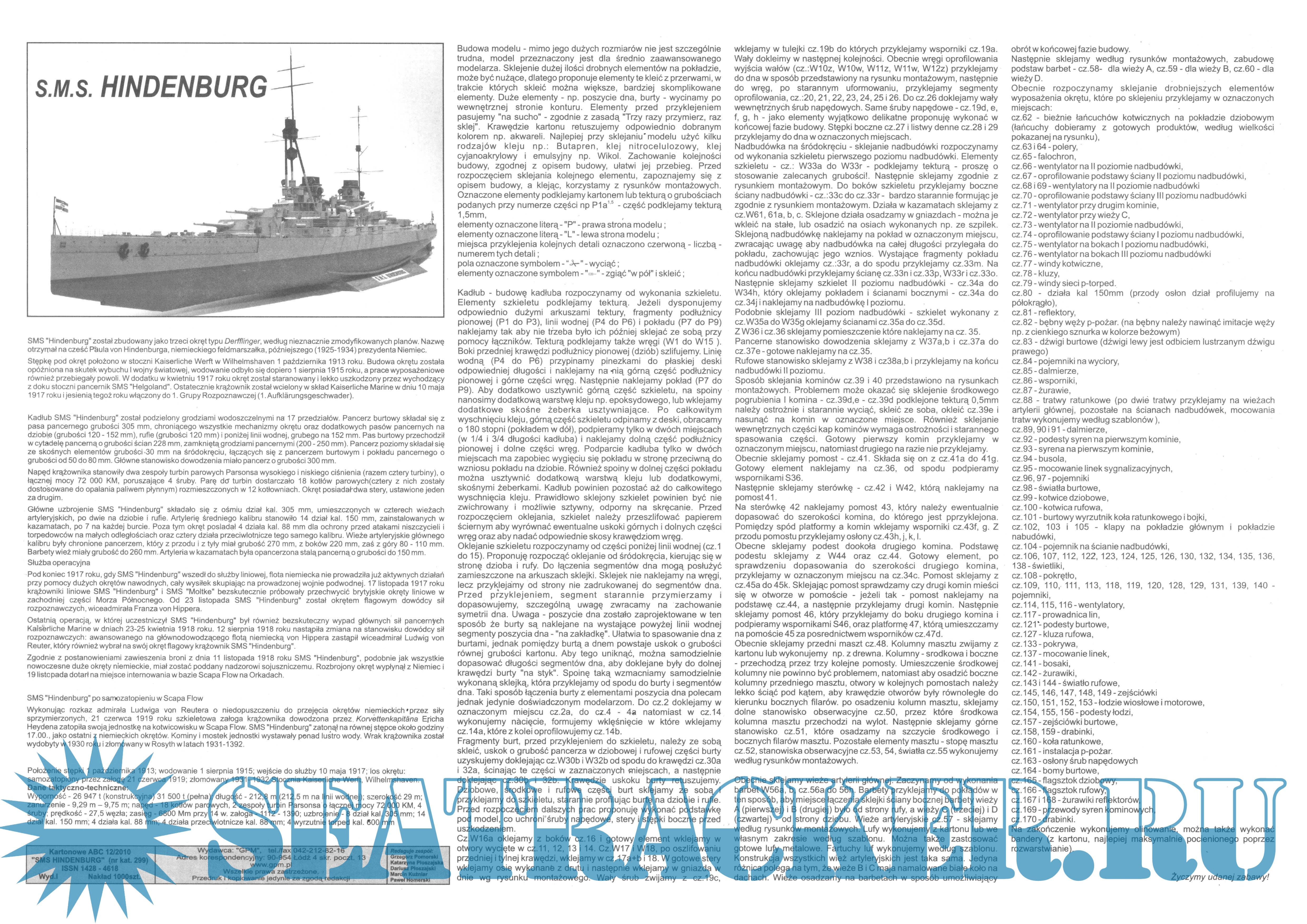 31 лист цветных выкроек и описаний для создания бумажной модели немецкого линкора SMS Hindenburg в масштабе 1:200