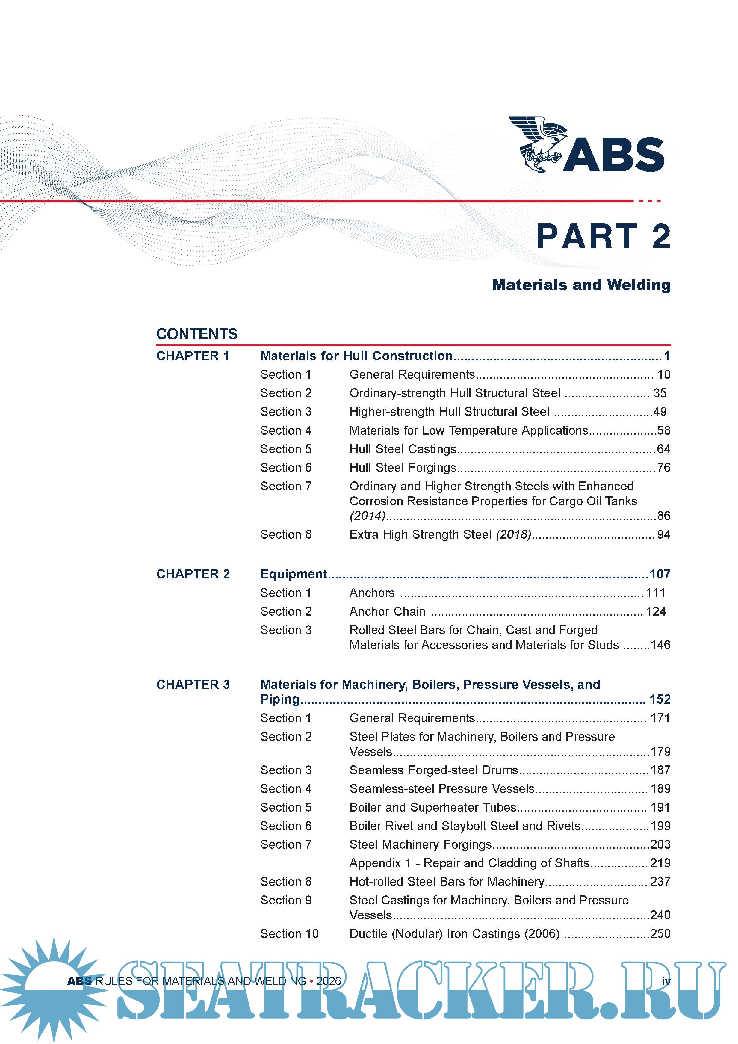 Year: 2026 Language: English Author: ABS Genre: Guide, Rules And Regulations Publisher: American Bureau of Shipping (ABS) Edition: January 2026 Format: PDF Quality: eBook Pages count: 830 Description: These Rules specify the ABS requirements for materials and welding for steel, aluminum and fiber reinforced plastics applicable to ABS classed vessels, other marine and offshore structures and their associated machinery. The Rules in Part 2 incorporate the International Association of Classification Societies (IACS) Unified Requirements (UR) W – Materials and Welding. Also refer to Technical Backgrounds (TB) (development histories) for unified requirements which are available on the IACS website (iacs.org.uk). The title “Rule Requirements for Materials and Welding (Part 2)” is intended to emphasize the common applicability of the material and welding requirements in “Part 2” to ABS classed vessels, other marine structures and their associated machinery, and thereby make “Part 2” more readily a common “Part” of the various ABS Rules and Guides, as appropriate.