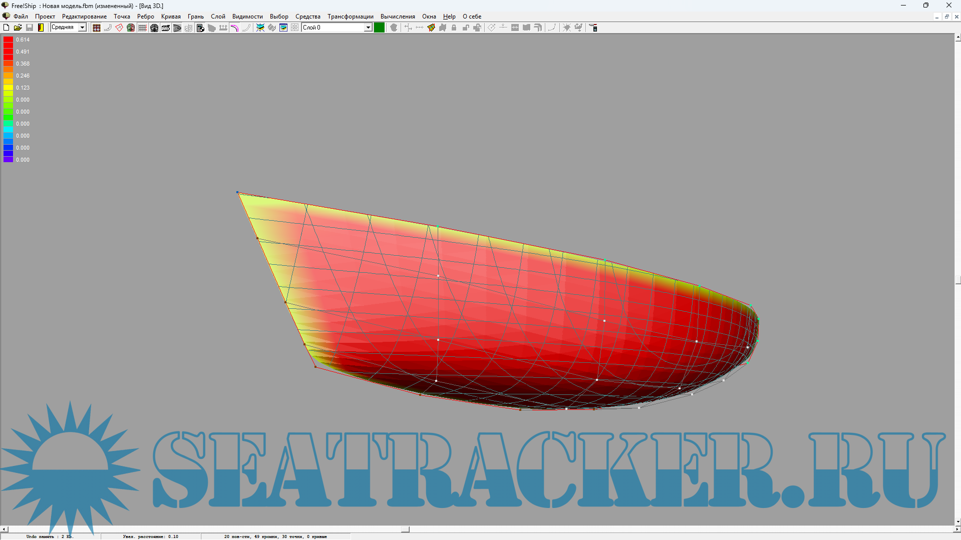 Ответ: При импорте VRML геометрии начало координат часто находится не в корме (на кормовом перпендикуляре AP) как принято во FREE!ship'e. Необходимо сместить координаты всех точек в нос и задать проектные длину, ширину и осадку. Как это сделать смотрите на видео: FS_1.avi и/или FS_2.avi и в документации п.4.1 (стр. 23) и п.14.2 (стр. 45). Для просмотра видео фрагментов может понадобиться установить кодек TSCC, ссылка в Downloads.