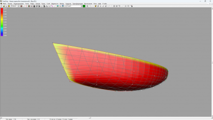Ответ: Выберите точку управления на днище в нужном сечении и, удерживая клавишу CTRL, кликните мышкой точку управления в этом же сечении на линии слома или редане. В окошке с координатами в нижней строке через точку с запятой увидите 3 значения углов между заданным вами вектором и осями координат судна. Второе значение и будет угол килеватости (примерно) в градусах.