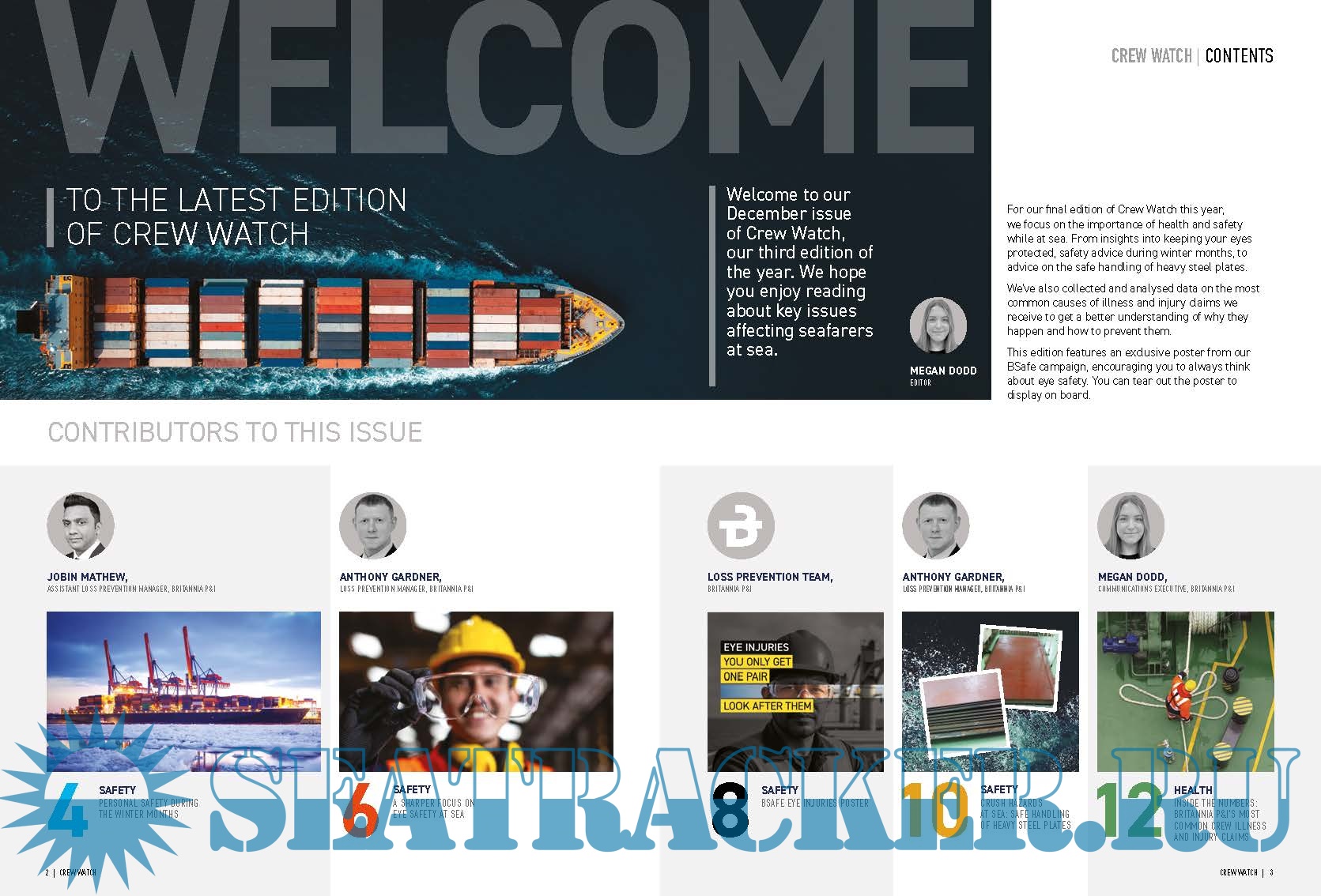 Year: 2025 Language: English Author: Britannia P&I Club Genre: Magazine Publisher: Britannia P&I Club Edition: December 2025 Format: PDF Quality: eBook Pages count: 16 Description: The publication of Crew Watch is aimed directly at Members’ crew with practical advice of topical Safety, Health and Welfare issue. For the final edition of Crew Watch this year, we focus on the importance of health and safety while at sea. From insights into keeping your eyes protected, safety advice during winter months, to advice on the safe handling of heavy steel plates. This edition features an exclusive poster from our BSafe campaign, encouraging you to always think about eye safety. You can tear out the poster to display on board.