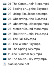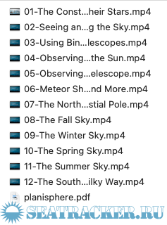 01-The Constellations and Their Stars.mp4 02-Seeing and Navigating the Sky.mp4 03-Using Binoculars and Backyard Telescopes.mp4 04-Observing the Moon and the Sun.mp4 05-Observing the Planets with a Telescope.mp4 06-Meteor Showers, Comets, Eclipses, and More.mp4 07-The Northern Sky and the North Celestial Pole.mp4 08-The Fall Sky.mp4 09-The Winter Sky.mp4 10-The Spring Sky.mp4 11-The Summer Sky.mp4 12-The Southern Sky and the Milky Way.mp4 Planisphere.pdf