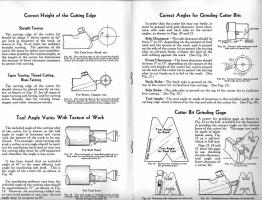 Year: 1938 Language: english Author: South Bend Lathe Works Publisher: SOUTH BEND LATHE WORKS Format: PDF Quality: Scanned pages Number of pages: 16 Description: Bulletin No. 35 Modern Shop Practice for Grinding Lathe Tool Cutter Bits 1 he cutting tool is one of the most important things to consider in the machining of metal in the lathe. In order to machine metal accurately and efficiently it is important that the cutter bit have a keen cutting edge, ground with the correct clearance, rake, etc., for the particular kind of metal being machined, and that the cutter bit be set at the correct height. In this booklet the latest shop practice for grinding various types of lathe tool cutter bits is outlined. The methods shown are used in our own shop, where we operate 150 Back-Geared, Screw Cutting Lathes on all kinds of machine work. The cutter bit is that part of the lathe tool which cuts the metal that must be removed to bring the work to the desired size and shape. The cutter bit is usually made of high speed steel and held in a lathe tool holder as shown in Fig. 2 at the top of the page. High speed steel cutter bits are hardened and are ready for use when properly ground. Fig. 3 at the right shows an unground cutter bit and Fig. 4 shows the same cutter bit after grinding. In I ig. 5 the cutter bit is shown mounted in the lathe tool holder, ready for use. Correct grinding of the lathe tool cutter bit is essential for good lathe work, because a properly ground cutter bit will produce better results, last longer and cut more freely than one improperly ground. I he forged steel tool holder as shown at the top of the page is made in three types, straight, right hand, and left hand, as shown at the right in Figs. 6, 1 and 8. These tool holders are also made in various sizes so they may be used in various size lathes. I hese different size tool holders also accommodate high speed steel cutter bits of the most practical size for the work they are intended to do. It is advisable when obtaining a tool holder to specify the size lathe on